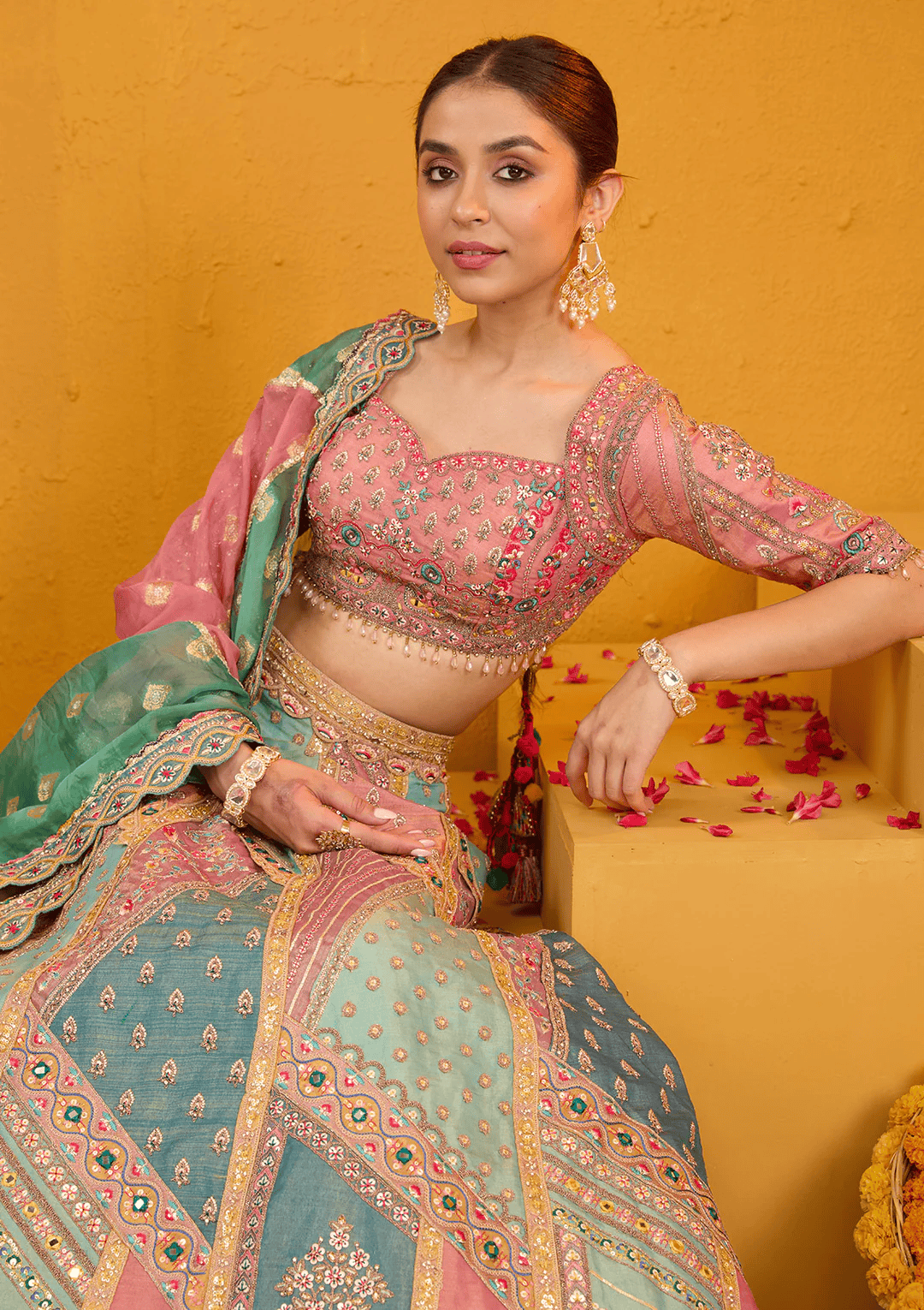 Step into a canvas of rich culture and regal charm with Koskii's Banarasi Lehenga, where every twirl tells a tale of elegance. Wrapped in the luxury of fine Banarasi fabric, this lehenga boasts vibrant multicolor embroidery that captures the essence of spirited celebrations. The meticulous threadwork on this masterpiece adds a hint of playfulness and grandeur, perfect for those who dress to impress and celebrate life with zeal!