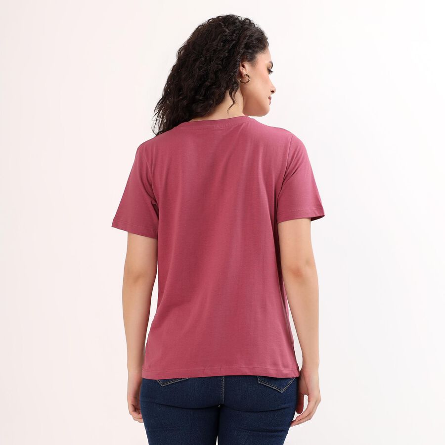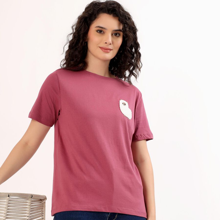 This Dusty Rose Round Neck T-Shirt is crafted from breathable cotton fabric for all-day comfort. Featuring a playful embroidered owl patch on the front, it adds a touch of whimsy to your casual wardrobe. Perfect for relaxed outings, pair it with denim jeans and sneakers for a chic look.